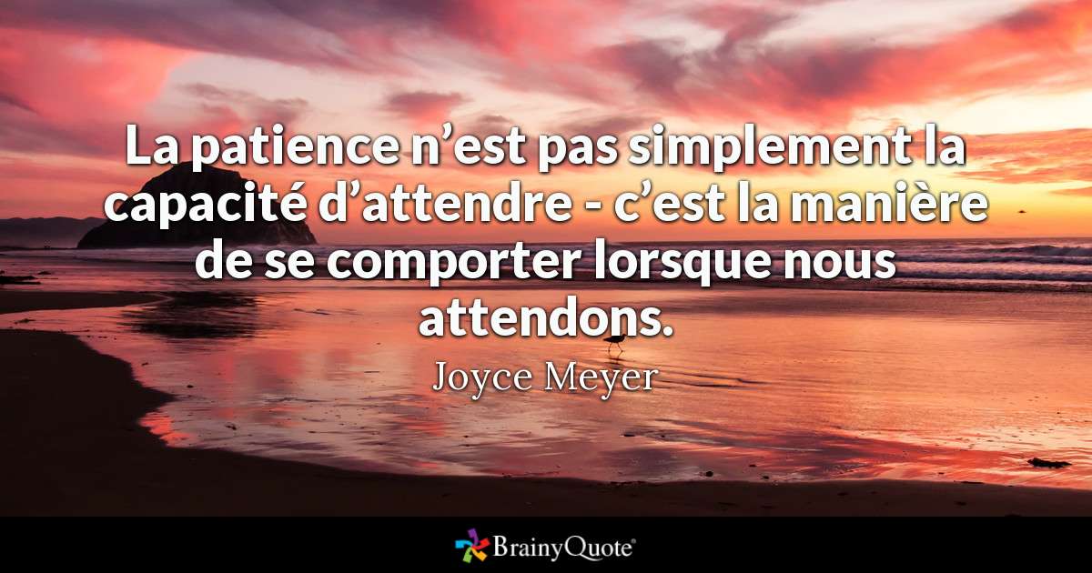 ~ Anonyme La patience d’un cœur est en proportion de sa grandeur. ~ Proverbe arabe Soyez patient. La patience est la mère de toutes les vertus. ~ Hrithik Roshan La patience était la plus grande des vertus des initiés antiques. ~ Gérard de Nerval La patience, la persistance et la transpiration constituent une combinaison imbattable de succès. ~ Napoleon Hill La patience est une vertu calomniée, peut-être parce qu’elle est la plus difficile à mettre en pratique. ~ Sigrid Undset La patience est la plus héroïque des vertus, précisément parce qu’elle n’a pas la moindre apparence d’héroïsme. ~ Giacomo Leopardi La patience n’est pas seulement la capacité à attendre, c’est la façon dont nous nous comportons lorsque nous attendons.