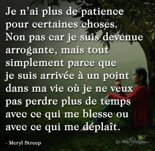 Ou bien tu peux décider d’apprendre la tolérance, la patience, la compréhension pour tout à coup découvrir que les conditions ne sont pas aussi pénibles que tu te le disais au début puisque maintenant tu vois les choses d’un œil différent. ~ Lise Bourbeau 4) Citations sur : Conséquences de l’impatience Celui qui précipite ses pas tombe. ~ Livre des Proverbes Perdre la patience, c’est perdre la bataille. ~ Anonyme Celui qui peut avoir de la patience peut avoir ce qu’il veut. ~ Benjamin Franklin L’homme sans patience, c’est comme une lampe sans huile. ~ Alfred de Musset Celui qui est à bout de patience perd la possession de son âme. ~ Francis Bacon Un moment de patience peut préserver de grands malheurs, un moment d’impatience détruit toute une vie.