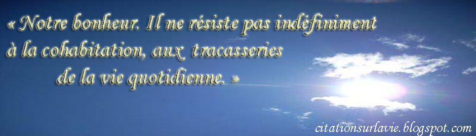 ~ Sénèque (Lettre à Lucilius) Ce que je ferai aujourd’hui doit être important, car j’y échange une journée de ma vie. ~ Martin Latulippe Un homme doit vivre de façon à pouvoir dire chaque soir ; je n’ai pas perdu ma journée. ~ Zohar Notre entourage, les événements quotidiens, les circonstances ordinaires, les habitudes issues de notre genre de vie, tout exerce sur nous une influence incessante, donc imperceptible, mais d’une extrême importance. ~ Novalis 4) Citations sur la vie quotidienne et les pensées : Ayez chaque jour une pensée d’amour pour tous. ~ Anonyme N’importe quelle activité quotidienne peut être harmonisée si on sait y introduire des pensées supérieures. ~ Denis St-Pierre Faisons de la vie quotidienne une œuvre d’art.