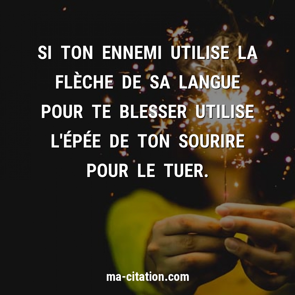 Citation de René Barjavel ; Ravage (1943) Ton sourire est pur comme le ciel, et j’y ai vu un infini d’amour. Citation de Rémy de Gourmont ; Les pensées inédites (1920) Ton sourire est si doux que je ne m’en fatiguerais jamais. Que j’aime ton sourire ! Citation de Rémy de Gourmont ; Un cœur virginal (1907) Un sourire ne dure qu’un instant, mais son souvenir est parfois éternel. Citation de Raoul Follereau ; Le livre d’amour, Le sourire (1920) Un sourire de presque rien peut être le signal du bonheur. Citation de Philippe Besson ; L’arrière-saison (2002) On peut tout dire en souriant. Citation de Paul Léautaud ; Le journal littéraire (1968) Il a dû apprendre à sourire chez le dentiste, ça ne lui vient pas spontanément.
